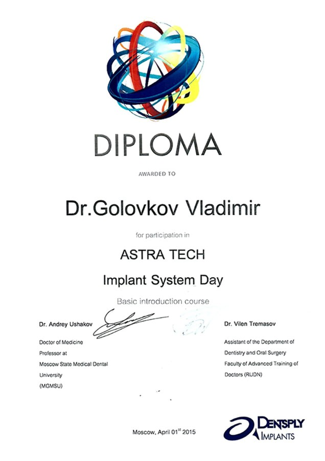 Сертификат об участии в курсе "Astra Tech. Implant System Day" г. Москва. Dentsply
