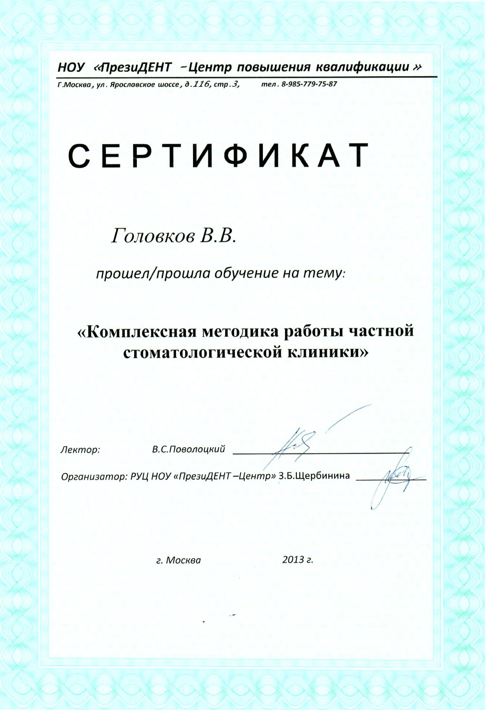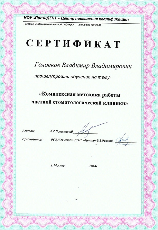 Сертификат об обучении на тему "Комплексная методика работы частной стоматологической клиники" г. Москва. НОУ "ПрезиДЕНТ - Центр повышения квалификации"