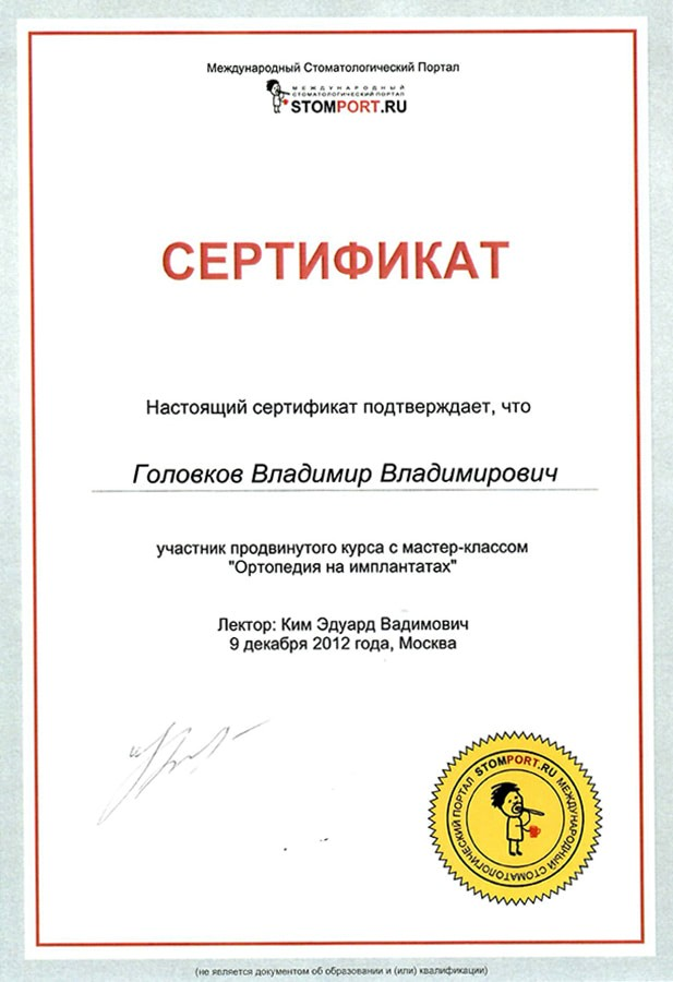 Сертификат участника продвинутого курса с мастер-классом "Ортопедия на имплантах" г. Москва. Международный Стоматологический Портал