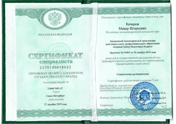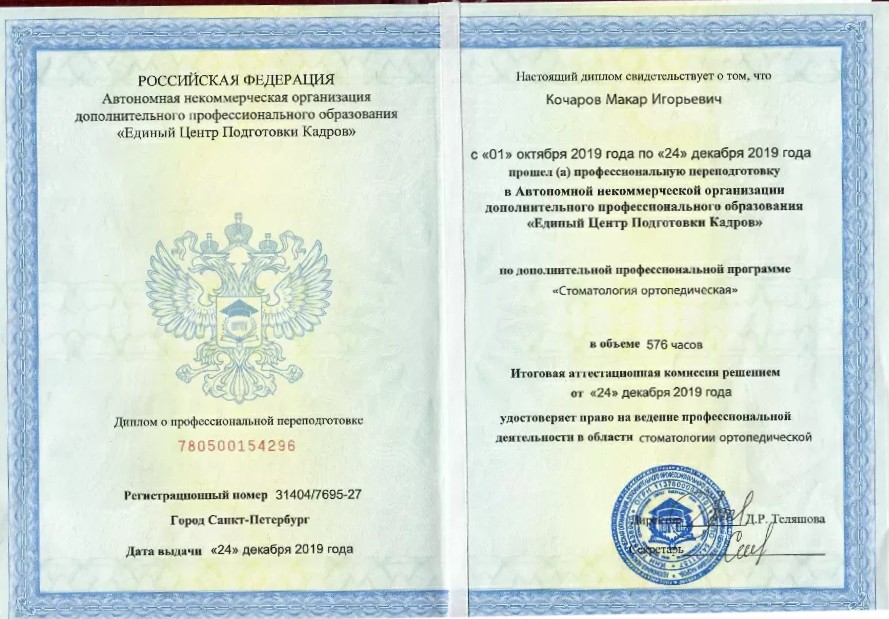 Специальность «Стоматолгия ортопедическая», Автономная некоммерческая органицация дополнительного профессионального образования «Единый Центр Подготовки Кадров», г. Санкт-Петербург, 2019 г.
