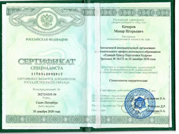 Специальность «Стоматология хирургическая», Автономная некоммерческая органицация дополнительного профессионального образования «Единый Центр Подготовки Кадров», г. Санкт-Петербург, 2020 г.