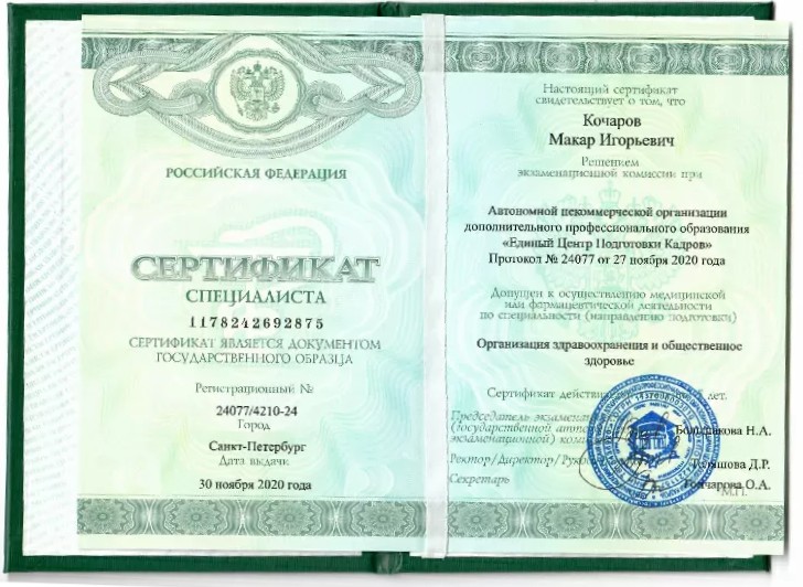 Специальность «Организация здравоохранения и общественное здоровье», Автономная некоммерческая органицация дополнительного профессионального образования «Единый Центр Подготовки Кадров», г. Санкт-Петербург, 2020 г.