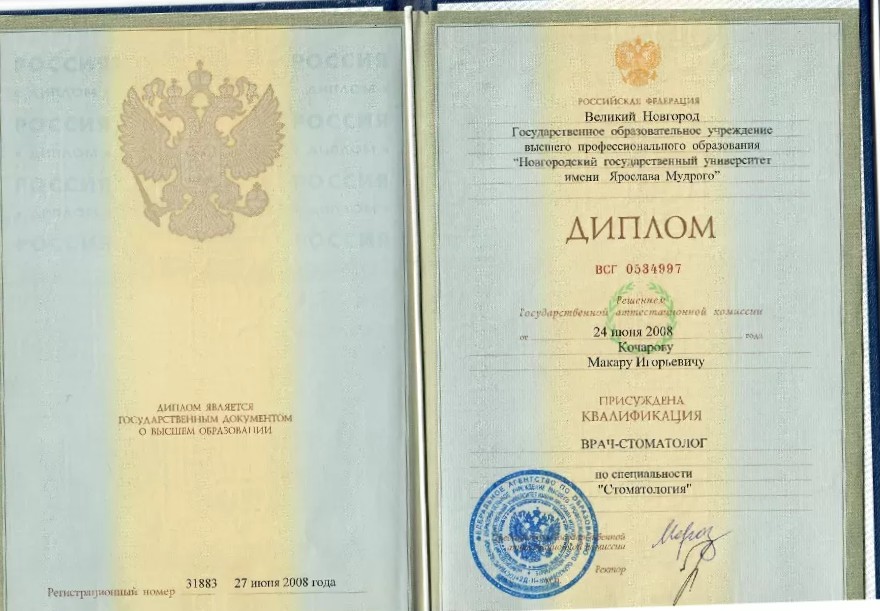 Специальность «Стоматология», Государственое образовательное учреждение высшего профессионального образования «Новгородский гусударственный универститет имени Ярослава Мудрого», г.Великий Новгород, 2008 г.