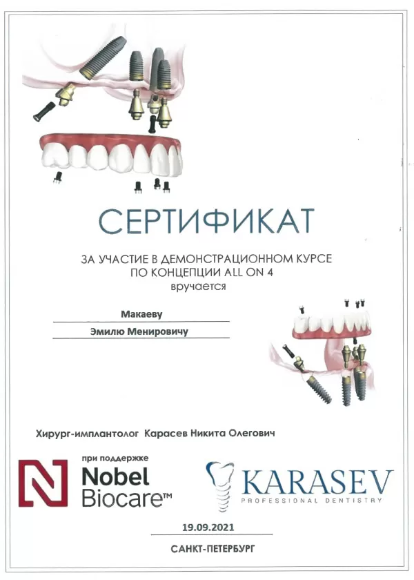 Сертификат за участие В ДЕМОНСТРАЦИОННОМ КУРСЕ ПО КОНЦЕПЦИИ ALL ON 4